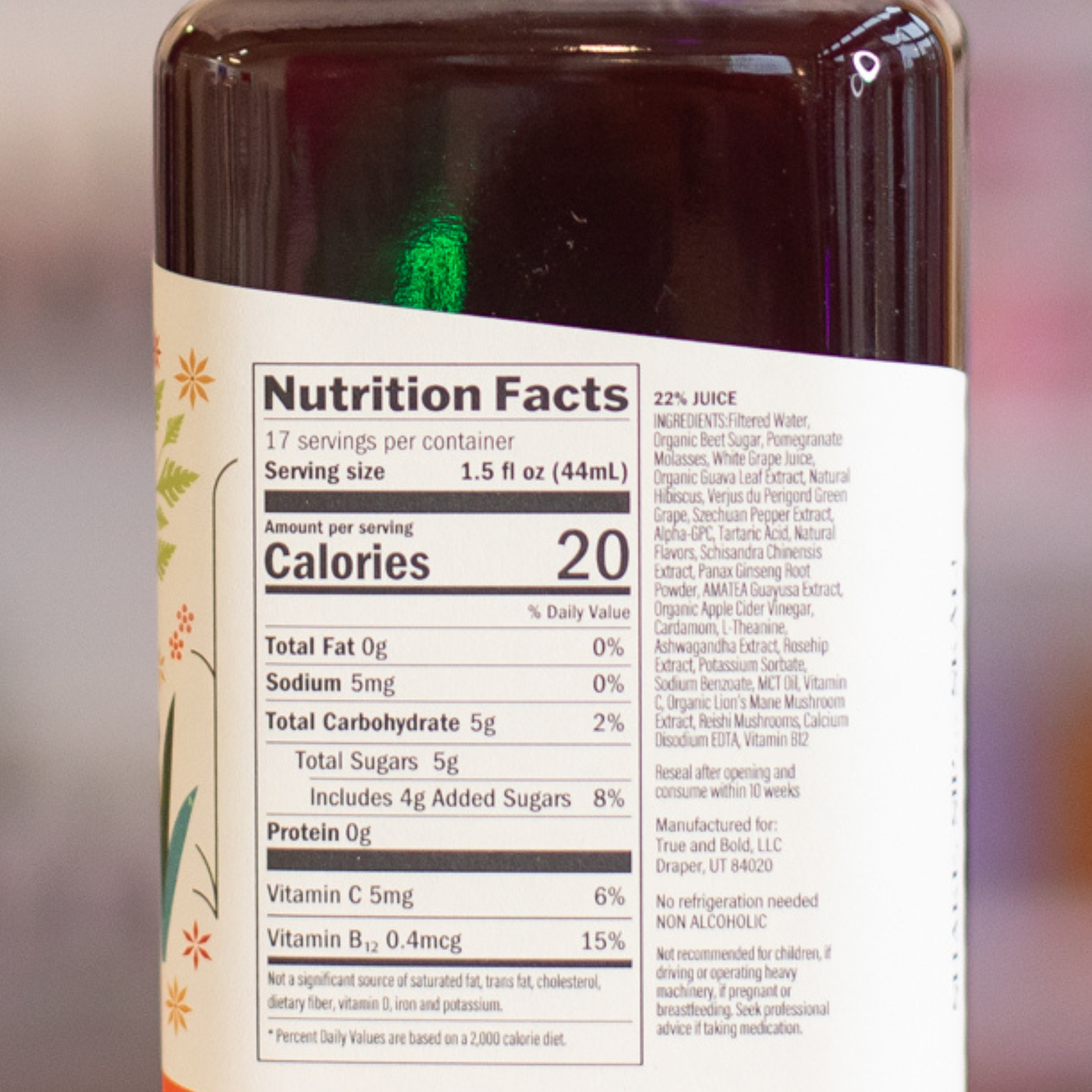 - Botanical extracts — pomegranate, hibiscus, ginger root, lemon balm, turmeric, citrus, herbs